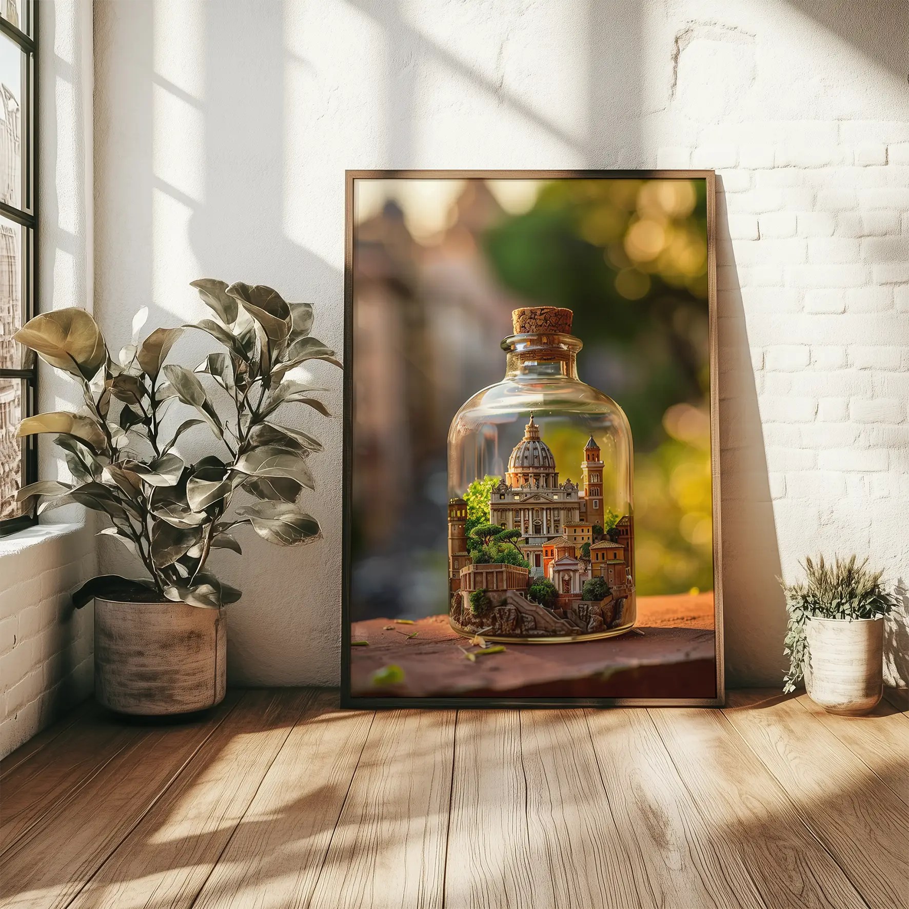 Experience the timeless charm of the Eternal City with our Rome in a Bottle poster. This unique piece captures the soul of Rome, blending its rich heritage and vibrant energy into a mesmerizing miniature cityscape within a glass bottle.